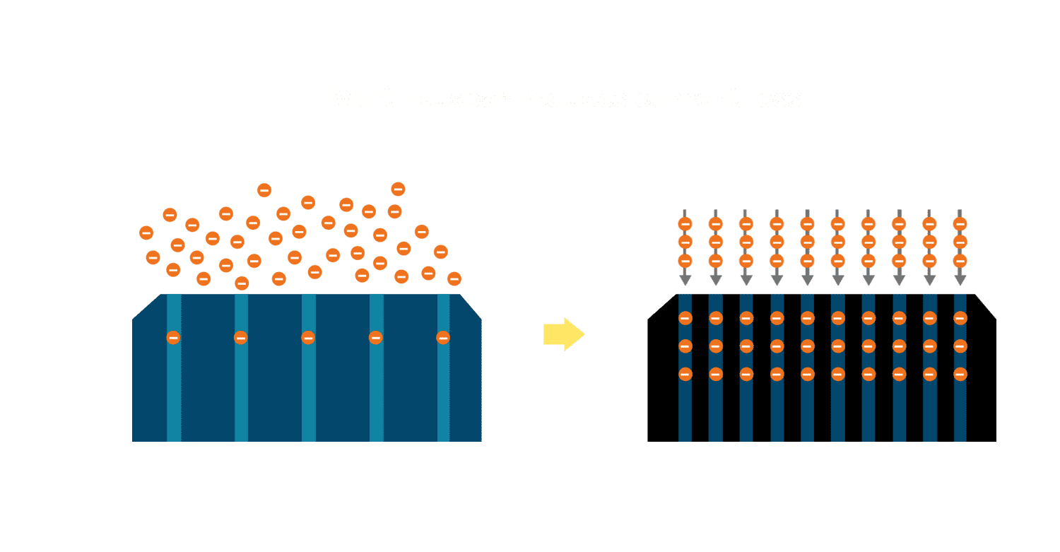 - 电池使用多条铜导线 (Copper wire) 于电池片上形成较短的电流路径,,,提高电流收集效率,,采用圆形设计的铜导线较传统扁平式的铜焊带 (Ribbon),,,,可增加入射至电池的光线量。。