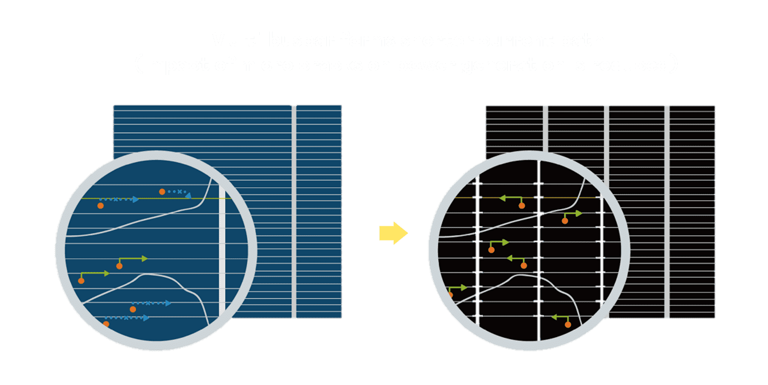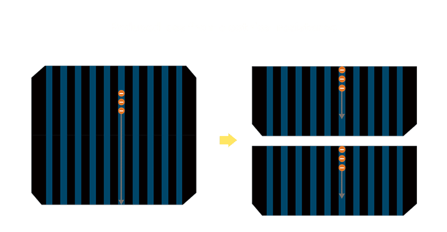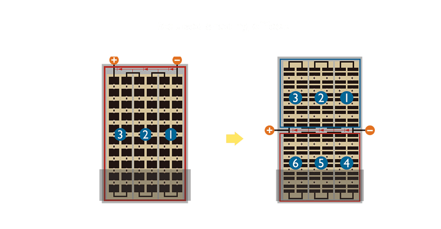 - 结合半切电池,,,,降低遮阴影响、、提升模组抗隐裂能力、、并减少电阻损耗,,,进一步提升模组发电效能。。